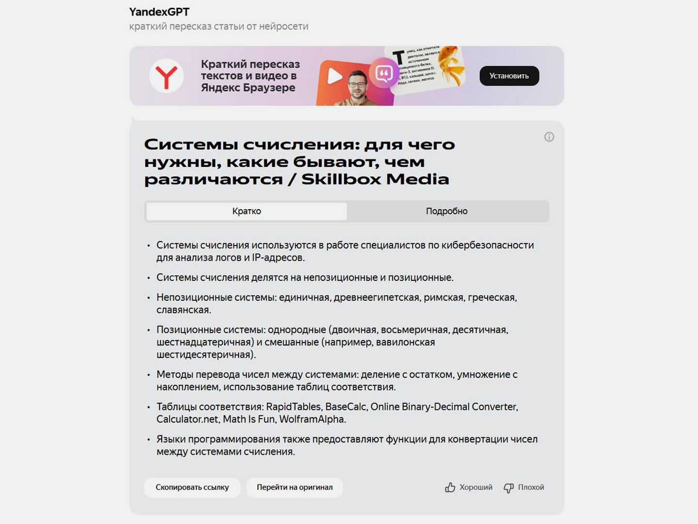 YandexGPT cũng được tích hợp vào dịch vụ 300.ya.ru, tóm tắt các văn bản và video lớn. Trên trang chính của dịch vụ, bạn cần chèn liên kết đến tài liệu và mạng nơ-ron sẽ làm nổi bật các điểm chính. Ví dụ, đây là cách YandexGPT tóm tắt bài viết của chúng tôi về hệ thống số.