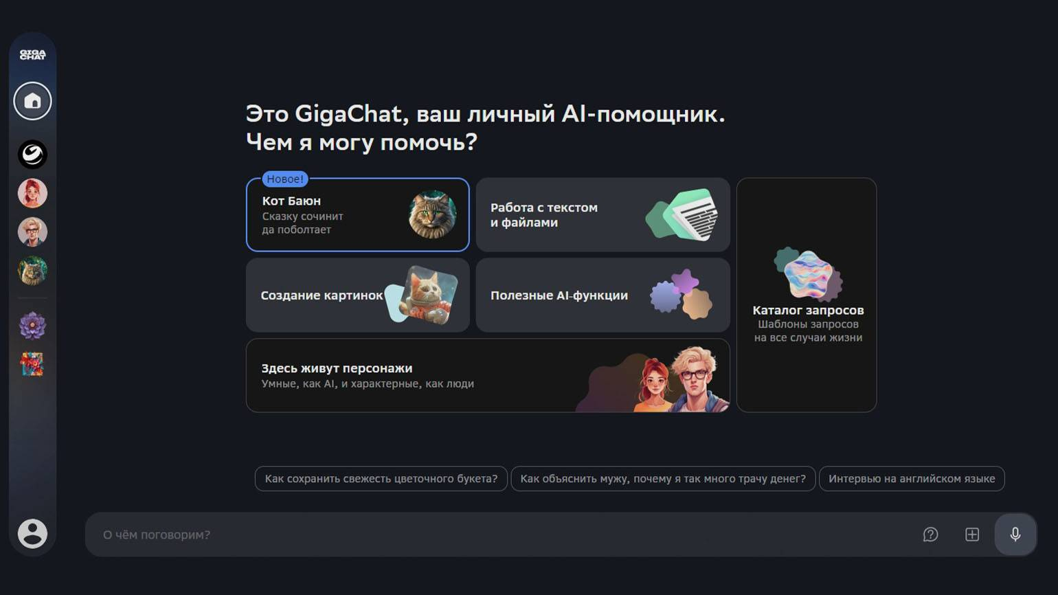 Ứng dụng web GigaChat có một tab riêng gọi là “Nhân vật” — đây là các tác nhân mạng nơ-ron được thiết kế để thực hiện các nhiệm vụ cụ thể. Ví dụ, một nhà tiếp thị AI sẽ đưa ra ý tưởng quảng bá sản phẩm, một luật sư thần kinh sẽ tư vấn về các vấn đề pháp lý và chú mèo Bayun sẽ sáng tác một câu chuyện cổ tích.