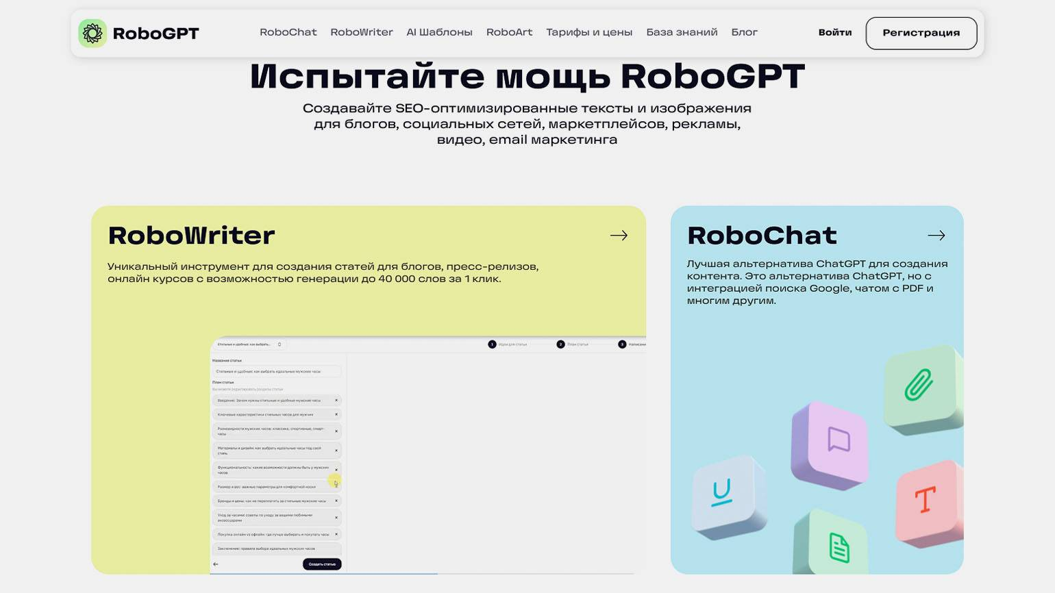 RoboWriter là công cụ tạo bài viết, thông cáo báo chí, khóa học trực tuyến, bài đăng và tin tức. RoboRewrite là công cụ diễn giải lại văn bản. RoboArt là dịch vụ tạo hình ảnh. "Mass Generation" là công cụ tạo mô tả SEO độc đáo cho sản phẩm. Dịch vụ có hai loại thanh toán: đăng ký và tín dụng. Trong trường hợp đầu tiên, một số tiền cố định sẽ được ghi nợ từ tài khoản của bạn hàng tháng và trong trường hợp thứ hai, bạn chỉ phải trả tiền cho nội dung bạn đã tạo. Nếu bạn hiếm khi sử dụng mạng nơ-ron, bạn có thể tiết kiệm tiền.