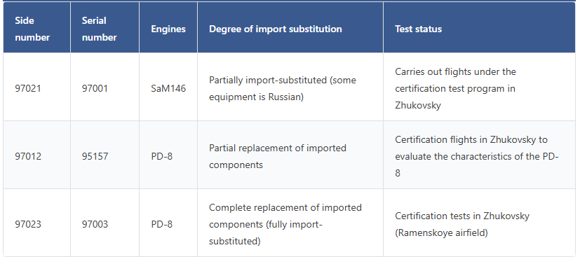 Ba máy bay thử nghiệm đang tham gia chương trình chứng nhận cho các phiên bản thay thế nhập khẩu của SSJ-100. Máy bay 97021 (số sê-ri 97001) được trang bị động cơ SaM146 và một phần thiết bị của Nga, đang thực hiện các chuyến bay chứng nhận tại Zhukovsky. Máy bay 97012 (95157) với động cơ PD-8 đã trải qua các thử nghiệm phát triển tại Komsomolsk-on-Amur, và sau chuyến bay đến Zhukovsky sẽ tham gia vào quá trình chứng nhận động cơ PD-8. Máy bay 97023 (97003) là mẫu máy bay thay thế nhập khẩu hoàn toàn đầu tiên với động cơ PD-8 – các chuyến bay thử nghiệm để chứng nhận thiết bị máy bay của Nga.