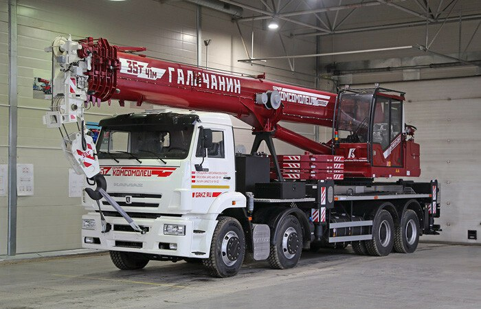 6. Công ty Galichanin đã giới thiệu một mẫu xe cẩu mới dòng Komsomolets trên khung gầm xe KAMAZ. Xe cẩu có sức nâng 35 tấn. Cần cẩu năm đoạn dài 41 mét cho phép nâng tối đa 1,7 tấn lên độ cao 57 mét. Cabin của người vận hành được trang bị hệ thống sưởi, điều hòa không khí, quạt và ổ cắm USB. Việc điều khiển được thực hiện bằng cần điều khiển thủy lực.
