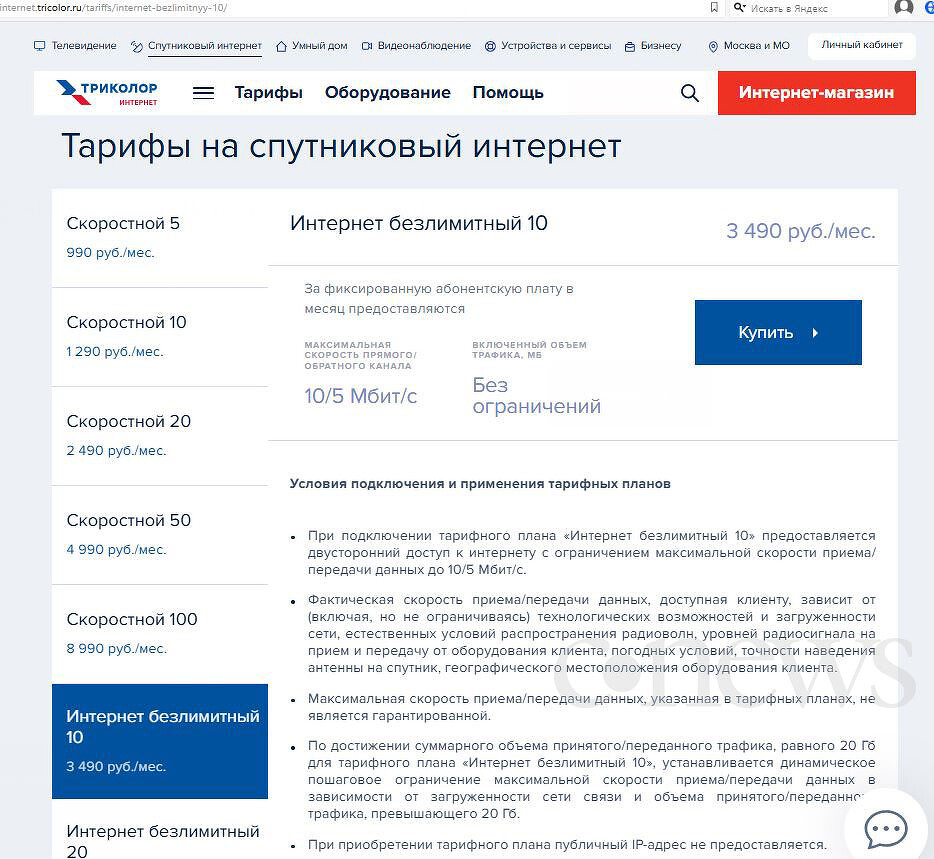 Nếu bạn cần internet không giới hạn, mức giá tối thiểu của Tricolor Internet là 3.490 rúp mỗi tháng cho gói "Internet Không Giới Hạn 10". Tốc độ tải/tải ngược tối đa trong trường hợp này là 10/5 Mbps, nhưng điều này không phải lúc nào cũng đúng. Điều khoản và điều kiện của gói cước nêu rõ: "Khi đạt tổng cộng 20 GB lưu lượng nhận/truyền cho gói "Internet Không Giới Hạn 10", tốc độ tải/truyền dữ liệu tối đa sẽ được giới hạn theo từng bước tùy thuộc vào tình trạng tắc nghẽn mạng và lưu lượng nhận/truyền vượt quá 20 GB."