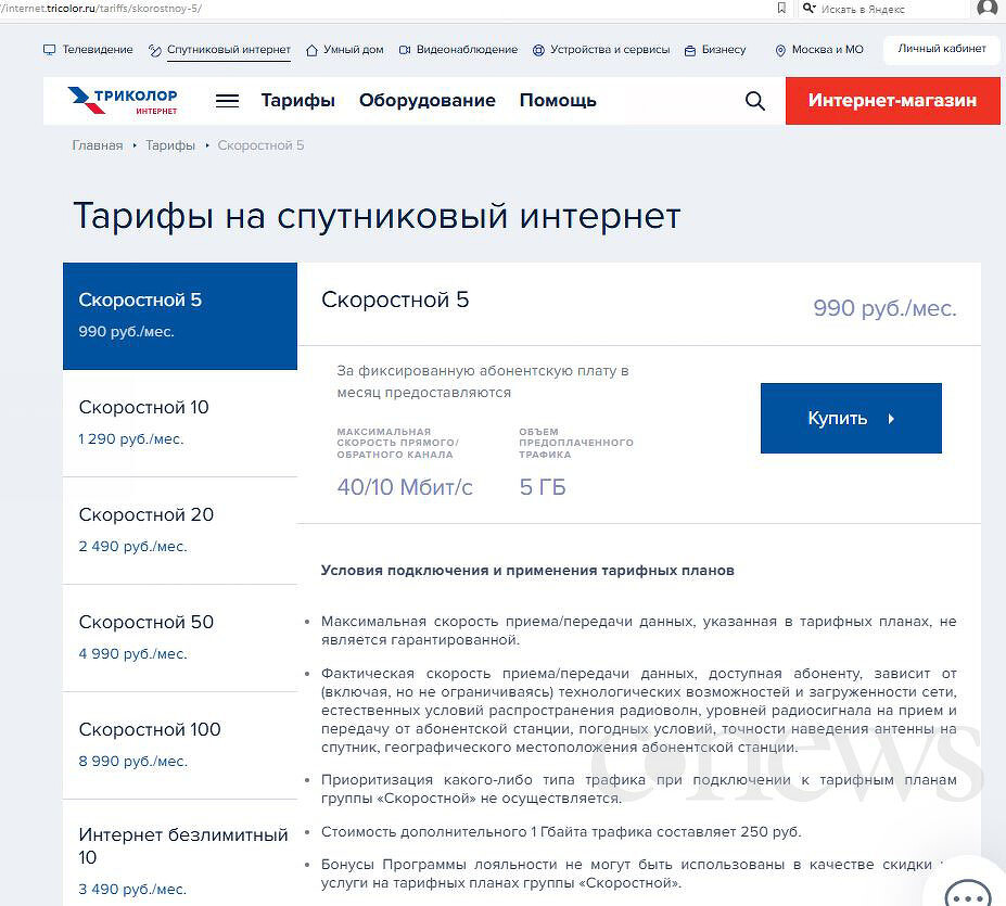 Ví dụ, CNews đã tìm thấy một gói cước trên trang web của Tricolor Internet, với gói cước tối thiểu là 990 rúp mỗi tháng. Mức giá này chỉ bao gồm 5 GB lưu lượng, với mỗi gigabyte vượt quá giới hạn này sẽ tốn thêm 250 rúp. Hơn nữa, tốc độ tải xuống và tải ngược tối đa (tải xuống và tải lên) của gói cước này thấp theo tiêu chuẩn hiện đại - chỉ lần lượt là 40 và 10 Mbps.