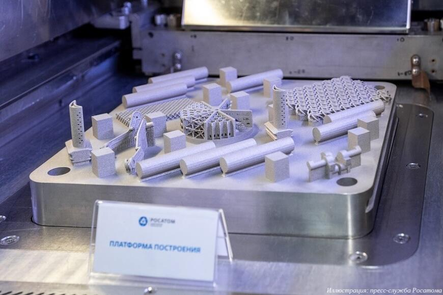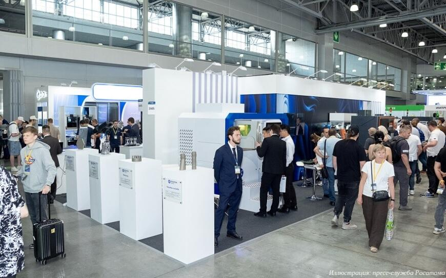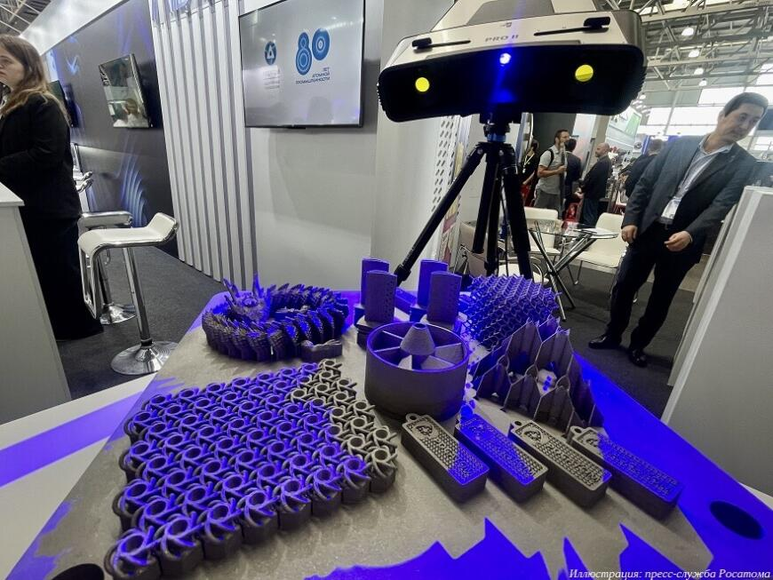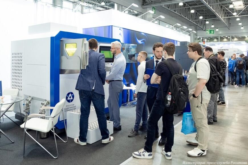 Gian hàng của Rosatom trưng bày máy in 3D Rusmelt 300M sử dụng công nghệ nung chảy laser chọn lọc (SLM), cũng như các vật tư tiêu hao in 3D được sản xuất tại các cơ sở công nghiệp hạt nhân và các mẫu sản phẩm in 3D—bao gồm ống, cánh quạt, đầu nối ống, xi lanh động cơ một xi lanh, lưới đệm cho cụm nhiên liệu lò phản ứng hạt nhân, v.v. Theo bộ phận báo chí của Rosatom, việc sử dụng công nghệ sản xuất bồi đắp cho phép giảm thời gian sản xuất, tối ưu hóa thiết kế và cải thiện các đặc tính chức năng và vận hành của các bộ phận.