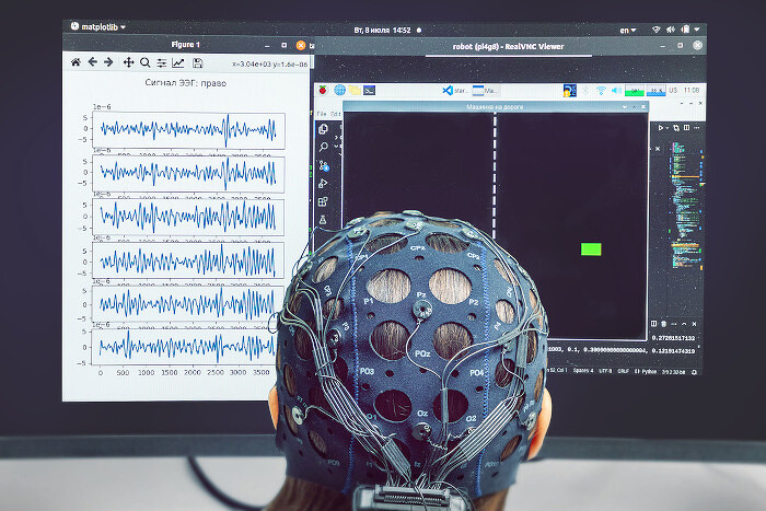 Tín hiệu não được đọc bởi mũ bảo hiểm EEG và gửi đến một bảng mạch có chip memristor được phát triển tại UNN Ảnh:Đại học nhà nước Lobachevsky ở Nizhny Novgorod