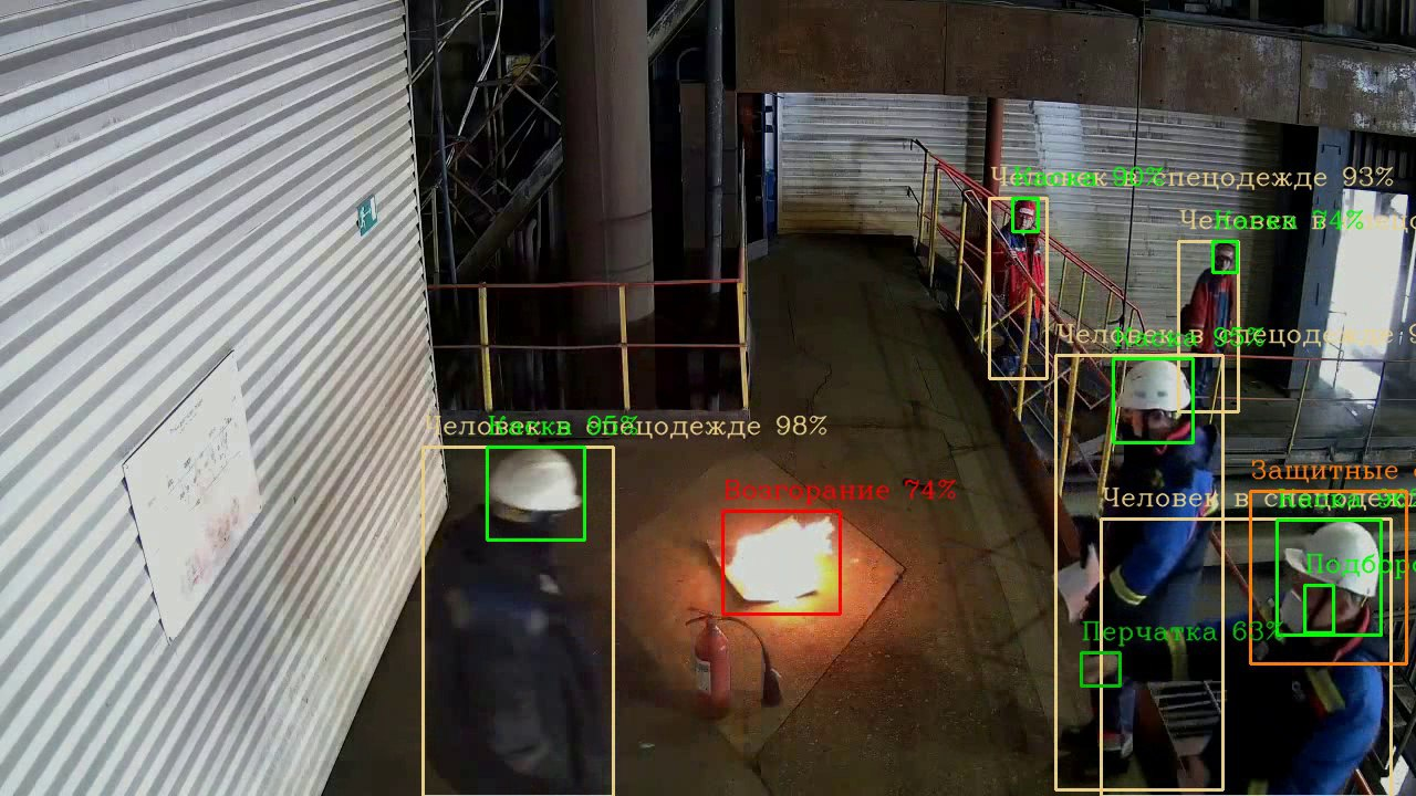 Camera ghi lại mọi chuyển động và tiến độ làm việc của nhân viên, và mạng nơ-ron phân tích luồng video, xác định các vi phạm an toàn và phòng cháy chữa cháy. Hệ thống truyền tín hiệu vi phạm đến màn hình của nhân viên phụ trách. Với cấu hình tích hợp, có thể tự động ra lệnh dừng thiết bị.