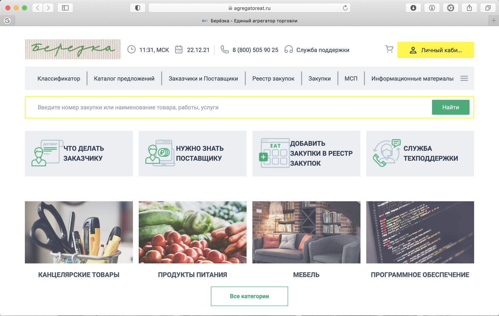 Giải thưởng “Khách hàng kinh tế của Nga năm 2022” đã được trao trong Diễn đàn-Triển lãm toàn Nga lần thứ XVIII “Goszakaz” cho đại diện của các vùng Voronezh, Ulyanovsk và Ryazan, những người đã tiết kiệm được 134 triệu rúp với sự trợ giúp của một công cụ tổng hợp thương mại duy nhất (EAT ) Beryozka. Tổng cộng, kể từ năm 2018, người dùng dịch vụ đã mua hàng với số tiền 116 tỷ rúp, tiết kiệm 6 tỷ rúp ngân sách nhờ EAT. Năm nay, nền tảng do RT-Project Technologies của Tập đoàn Nhà nước Rostec tạo ra đã được tham gia bởi các khu vực mới của Nga - khu vực DPR, LPR, Kherson và Zaporozhye.