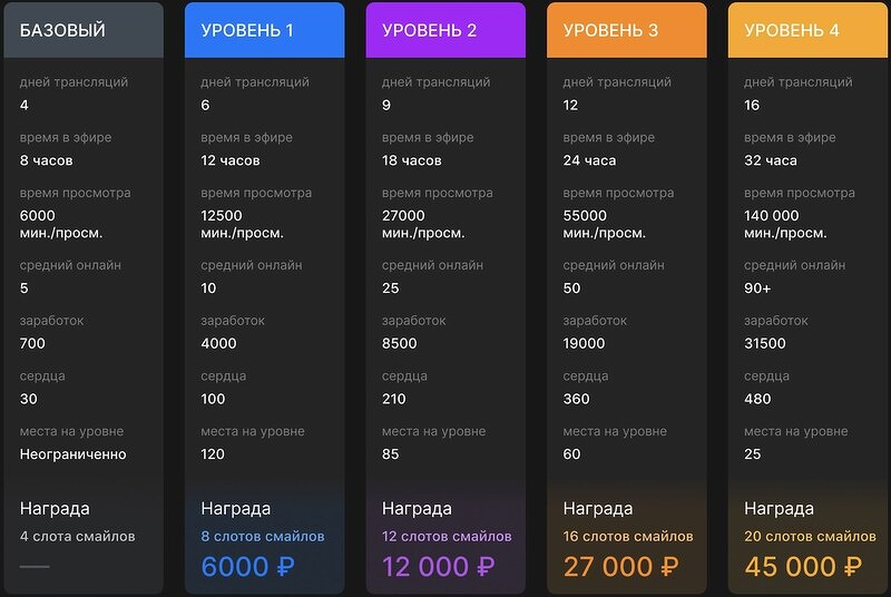 Người dùng sẽ có một tháng để kiếm từ 6000 rúp. lên tới 45 nghìn rúp Phần thưởng bằng tiền phụ thuộc vào số lượng luồng được thực hiện (tối thiểu sáu ngày phát sóng, tối đa 16), thời gian phát sóng (từ 12 đến 32 giờ), số lượt xem và một số thông số khác, bao gồm số lượng " thích ”.