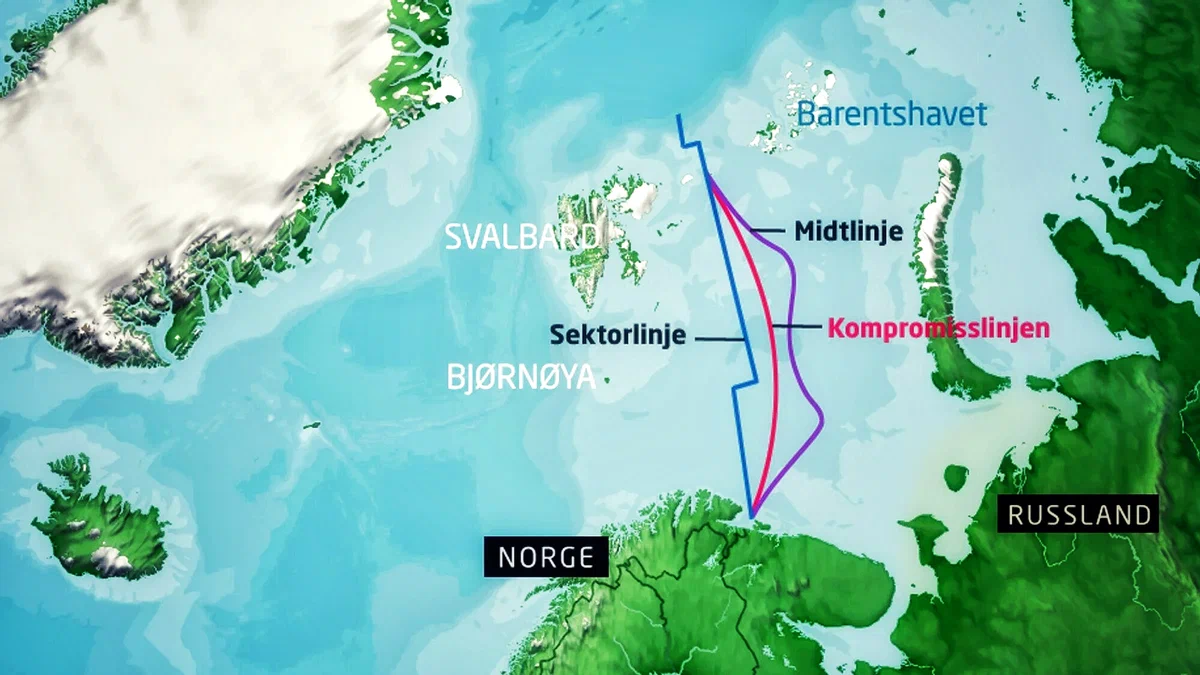 Một phần của thềm mà theo thỏa thuận năm 2010, Nga đã nhượng lại cho Na Uy (lằn ranh đỏ). Đường màu xanh lam là đường phân định mà Nga đã khẳng định cho đến năm 2010