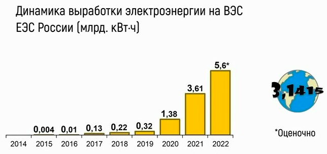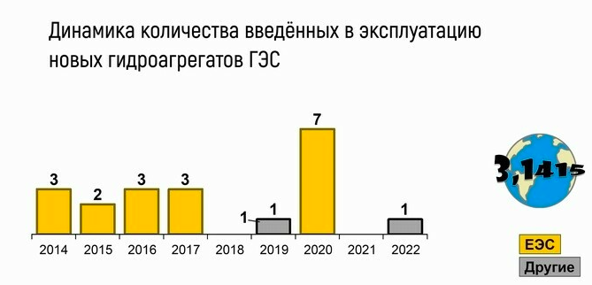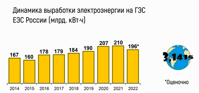 Kể từ năm 2014, sản lượng điện tại các nhà máy thủy điện của UES của Nga đã tăng hơn 40 tỷ kWh vào năm 2021 (việc giảm sản lượng điện vào năm 2022 là do hàm lượng nước của các con sông ở Siberia thấp) và tỷ trọng sản xuất điện của nhà máy điện của UES của Nga tăng từ 16,3% lên hơn 17% .