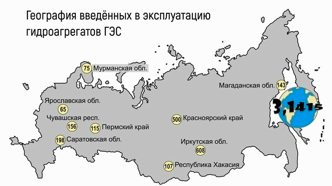 Vị trí địa lý của các tổ máy thủy điện được vận hành vào năm 2022 kéo dài từ vùng Saratov, nơi cánh quạt được thay thế ở tổ máy thủy điện cập nhật thứ mười tám, và đến vùng Magadan, nơi RusHydro vận hành tổ máy thủy điện thứ tư tại Ust-Srednekanskaya HPP.