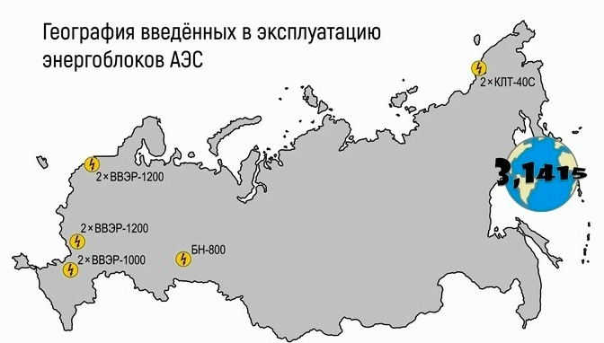 Ngoài ra, ở Nga, việc xây dựng các tổ máy điện mới đang được tiến hành - hai tổ máy tại Nhà máy điện hạt nhân Kursk với lò phản ứng VVER-TOI, một tổ máy tại Nhà máy Hóa chất Siberi ở Seversk với lò phản ứng BREST-OD-300, và một tổ máy tại Nhà máy Hóa chất Siberia ở Seversk. địa điểm của SSC RIAR ở Dimitrovgrad với lò phản ứng MBIR.