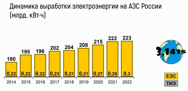 Sản lượng điện tại các nhà máy điện hạt nhân của UES của Nga, so với cùng kỳ, tăng từ 180 lên 223 tỷ kWh (tăng 24% hay 43 tỷ kWh) và tỷ trọng sản xuất điện của các nhà máy điện của UES của Nga từ 17,6 % đến gần 20%. Tại các nhà máy điện hạt nhân trong hệ thống năng lượng cách ly công nghệ, sản lượng điện tăng 34% lên 295 triệu kWh .