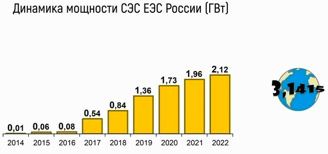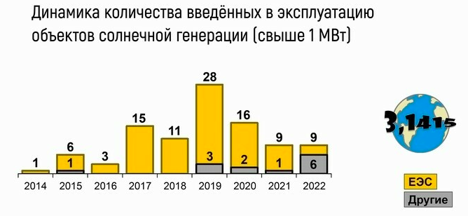 Kể từ năm 2014, công suất của các nhà máy điện mặt trời có trong UPS của Nga đã vượt quá 2 GW và tỷ lệ trong công suất lắp đặt của các nhà máy điện của UPS của Nga đã tăng từ 0 lên 0,85%. Công suất của các nhà máy điện lớn bên ngoài EEC ít nhất là 28 MW .