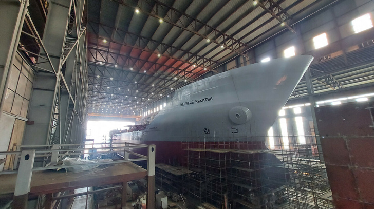 Động cơ chính có trọng lượng gần 60 tấn, được đặc trưng bởi công suất và hiệu quả năng lượng cao hơn, nó sẽ cho phép con tàu thực hiện các chuyến đi dài với vai trò hộ tống các tàu của Bộ Quốc phòng Nga. Sau khi tải các thiết bị có kích thước lớn, công nhân nhà máy sẽ tiếp tục hình thành buồng máy, thân tàu phía sau và cấu trúc thượng tầng.