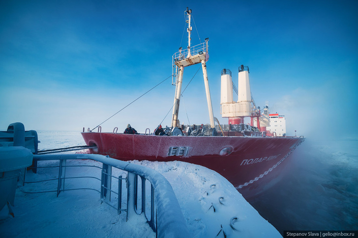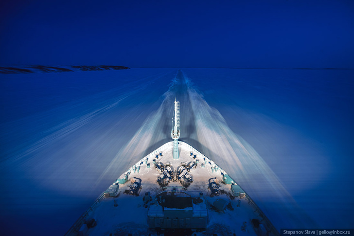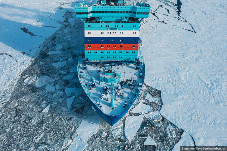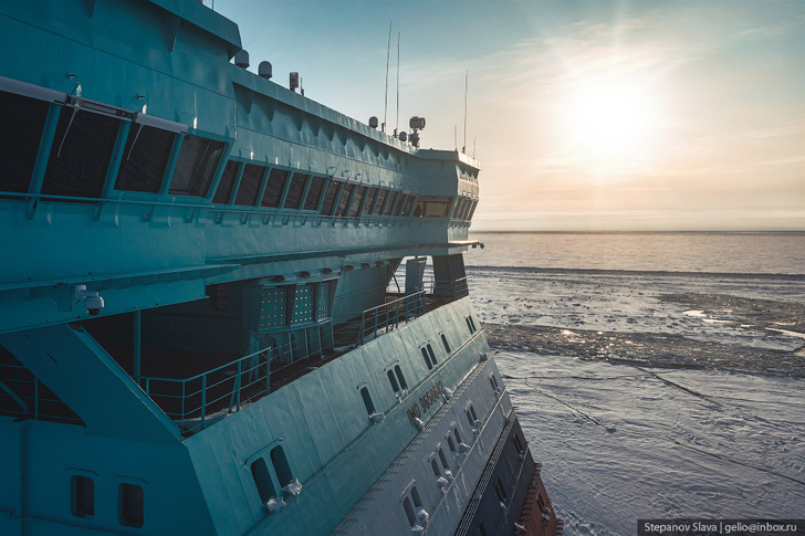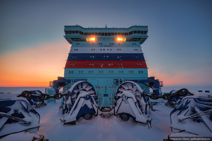 42. Tàu phá băng hạt nhân hiện đại là một thành phố thu nhỏ dành cho 54 người. Tất cả các thiết bị đều hiện đại và nhiệt độ như nhau được duy trì trong cơ sở quanh năm. Thời tiết ở Bắc Cực có thể thay đổi nhiều lần trong ngày, gió trên boong đôi khi đạt tới 40 m/s. Và bên trong tàu phá băng - 22 ° C yên tĩnh và thoải mái.
