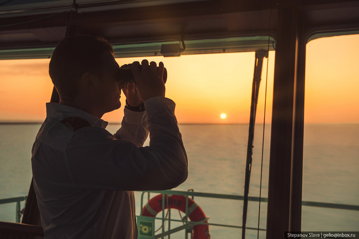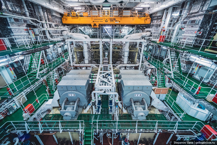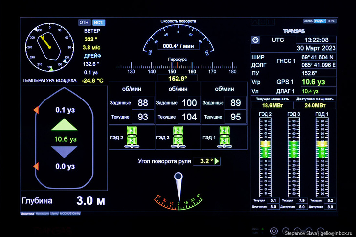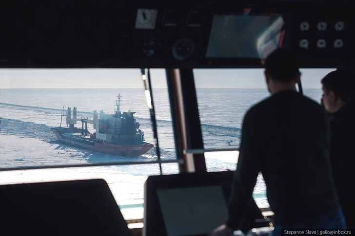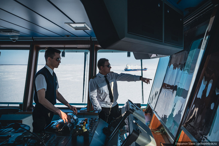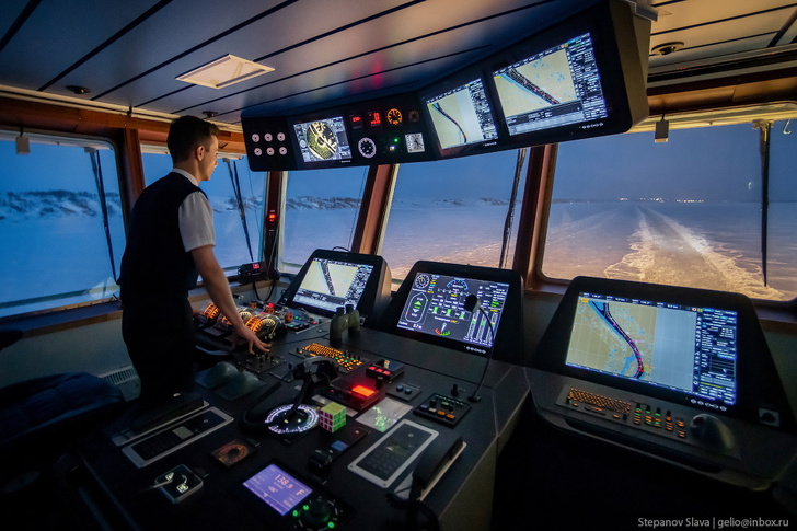 43. Đội nói rằng tàu phá băng là một chiếc máy tính khổng lồ. Tất cả các điều khiển ở đây đều mới, trên màn hình có đầy đủ thông tin về trạng thái của tàu. Trong buồng lái có đầy đủ các thiết bị vô tuyến điện và dẫn đường, bảng điều khiển cầu dẫn đường, thiết bị khí tượng, hệ thống điều khiển máy lái.