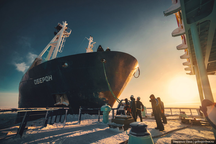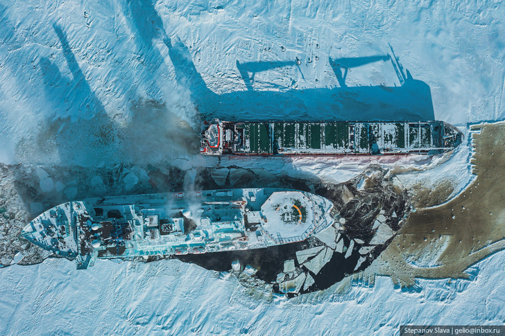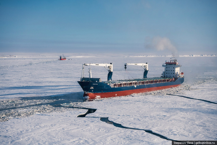 35. Khi con tàu chuẩn bị khởi hành, một tàu phá băng được gọi đến. Thông thường, trong quá trình bốc hàng, kênh và nước xung quanh tàu được bao phủ bởi băng. Đầu tiên, tàu chạy bằng năng lượng hạt nhân cập nhật luồng tiếp cận và điểm ngoặt. Nếu con tàu bị đóng băng thành băng, tàu phá băng sẽ thực hiện nghiêng để có thể đưa nó ra phía sau bến băng. Tàu phá băng, di chuyển phía đuôi tàu về phía trước, cẩn thận phá băng rất gần tàu vận tải.