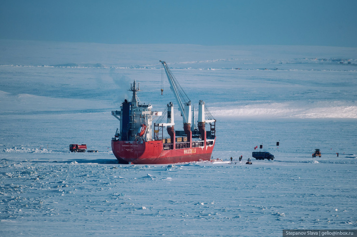 29. Vào mùa đông, ở phía bắc Yenisei, không thể vận chuyển hàng hóa nếu không có tàu phá băng hạt nhân. Không có cảng biển, không có kết nối giao thông đường bộ với Dudinka, dòng sông bị băng bao phủ. Bây giờ một bệ băng đặc biệt đang được chuẩn bị để dỡ tàu. Xe tải chạy lên tàu và việc bốc hàng thường được thực hiện bằng cần cẩu và các thiết bị được lắp đặt trên boong. Những nơi xếp dỡ như vậy được gọi là bến băng. Ví dụ, trên Yenisei, các khu vực dỡ hàng như vậy hoạt động trong khu vực của các làng Vorontsovo và Karaul, cách Mũi Tanalau không xa.