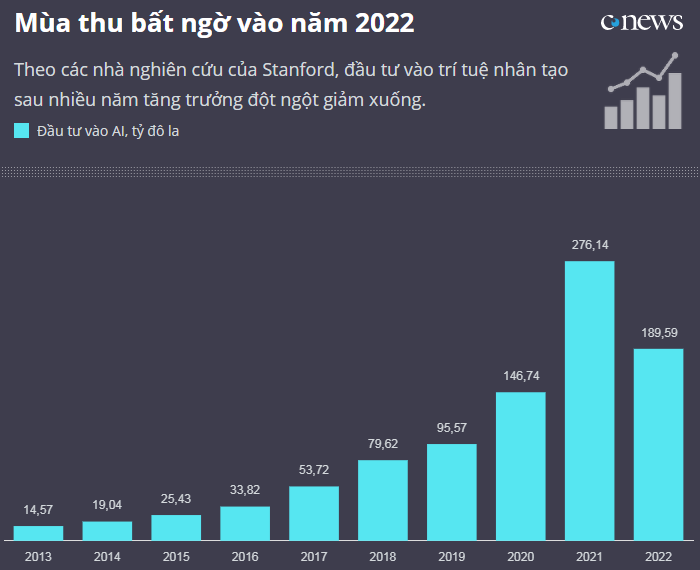 Đồng thời, theo các nhà phân tích của Đại học Stanford, đầu tư của công ty vào trí tuệ nhân tạo vào năm 2022 lần đầu tiên giảm trong mười năm qua và gần một phần ba. Những khoản đầu tư này bao gồm tài trợ thông qua sáp nhập và mua lại, mua cổ phần, vốn cổ phần tư nhân, niêm yết.