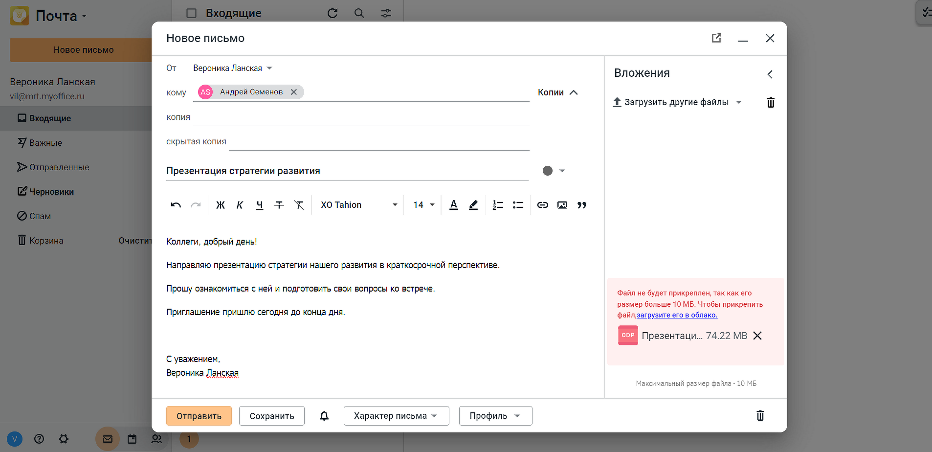 Trong số những tính năng khác, bắt đầu từ bản phát hành 2.6, người dùng có thể tải tệp đính kèm từ My Office Private Cloud 2 lên các cuộc trò chuyện trực tiếp từ không gian làm việc kỹ thuật số Squadus 1.2 . Chỉ những người đã được cấp quyền truy cập vào tài liệu mới có thể mở tệp từ bộ lưu trữ của công ty. Phần còn lại sẽ cần phải yêu cầu thêm sự cho phép từ chủ sở hữu tệp. Bạn có thể tải lên bất kỳ loại tệp nào và không bị hạn chế về số lượng tệp đính kèm.