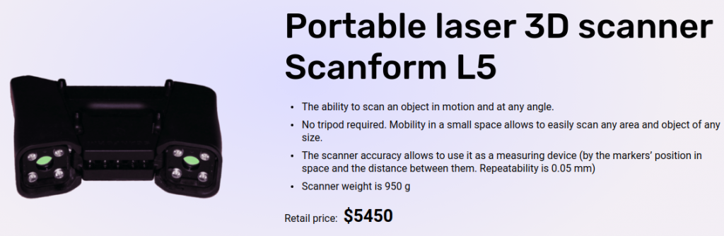 Máy quét 3D laser cầm tay HR12L5 là mô hình sản xuất đầu tiên dưới thương hiệu Scanform. Thiết bị này được thiết kế để tăng khả năng chi trả: theo nhà sản xuất, với giá bán lẻ 345.000 rúp, chất lượng quét của HR12L5 có thể so sánh với các thiết bị tương tự có giá trên một triệu rúp.