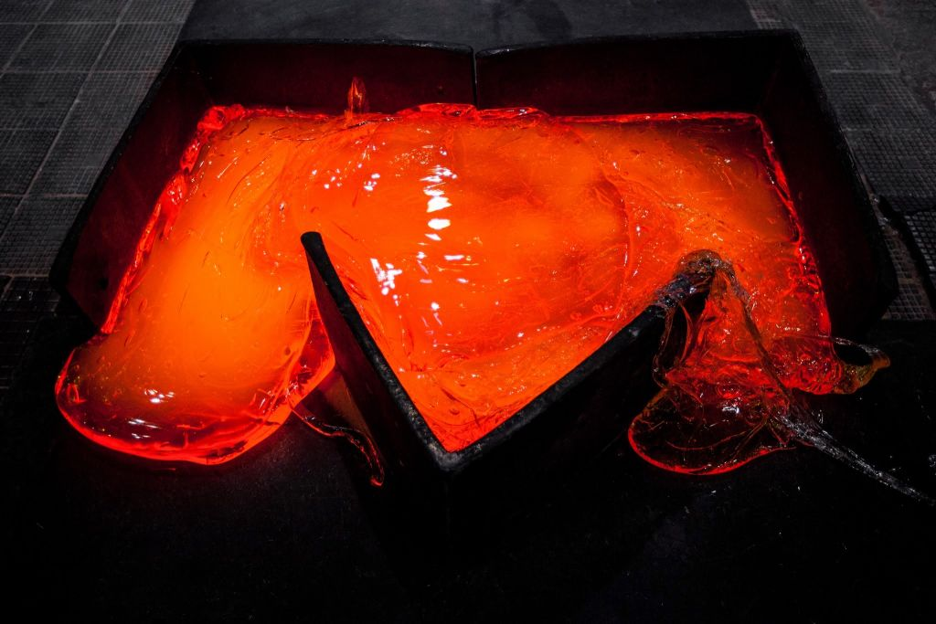 Làm nguội trong lò Tiếp theo, cần cẩu đặc biệt dùng kìm để lấy nồi nấu chảy ra khỏi lò. Lớp kính phía trên, mát hơn, được gọi là lớp láng nền, được loại bỏ - nó có thể chứa tạp chất hoặc bong bóng. Sau đó, vòi sẽ lật úp nồi và đổ ly vào khuôn, nơi ly sẽ tiếp tục nguội. Các hình dạng có thể có kích thước khác nhau tùy thuộc vào mục đích sử dụng kính trong tương lai.