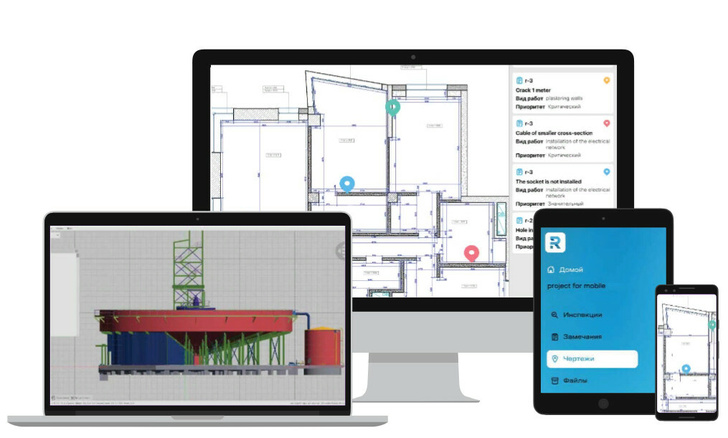 Đối với mục đích kiểm soát xây dựng, nền tảng được sử dụng như sau: nhân viên sử dụng điện thoại thông minh hoặc máy tính bảng đã cài đặt ứng dụng. Theo các quy tắc xác minh đã chỉ định, cũng tính đến các yêu cầu quy định của Liên bang Nga, các vi phạm được phát hiện sẽ được ghi lại trong ứng dụng trực tiếp trên bản vẽ 2D hoặc mô hình 3D bằng cách cài đặt các dấu đặc biệt. Dựa trên dữ liệu kiểm tra, một hành động được tạo tự động và tất cả những người chịu trách nhiệm đều được thông báo - cả nhà thầu và khách hàng. Tất cả các ghi chú và dữ liệu đều được đồng bộ hóa nên sẽ không bị mất mà sẽ được chuyển ngay lập tức và có sẵn trên PC ở văn phòng hoặc ở nhà.