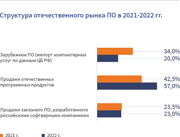 Hiệp hội không tiết lộ bất kỳ thay đổi rõ ràng nào về doanh số bán dịch vụ phát triển phần mềm tùy chỉnh tại thị trường nội địa. Các dịch vụ này chiếm 23% tổng thị trường phần mềm vào cuối năm 2022 (năm 2021 con số này là 23,5%). Tuy nhiên, thị phần của các sản phẩm phần mềm trong nước đã tăng đáng kể - từ 42,5% lên gần 57% (doanh số tuyệt đối của chúng tăng 35% tính bằng rúp và 45% bằng đô la).