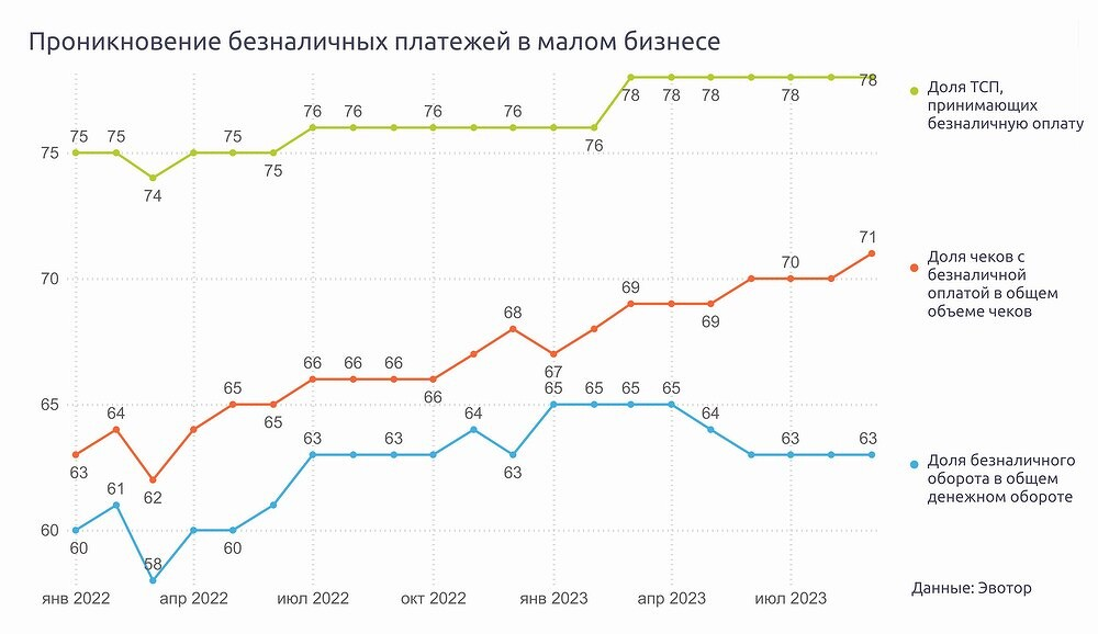 Theo Evotor, tỷ lệ giao dịch không dùng tiền mặt ở các doanh nghiệp bán lẻ nhỏ đã tăng trong năm từ 66% lên 71% vào tháng 9 năm 2023. Tỷ lệ các doanh nghiệp thương mại và dịch vụ chấp nhận thanh toán không dùng tiền mặt tăng từ 76 lên 78%. Lần đầu tiên, tỷ lệ giao dịch không dùng tiền mặt đạt 90% tại Khu tự trị Nenets (vào tháng 9 năm 2022 - 85%). Tỷ lệ giao dịch không dùng tiền mặt ở Moscow đã tăng từ 78 lên 79%, ở St. Petersburg - từ 74 đến 79%. Đại diện của Evotor đã báo cáo điều này với CNews .