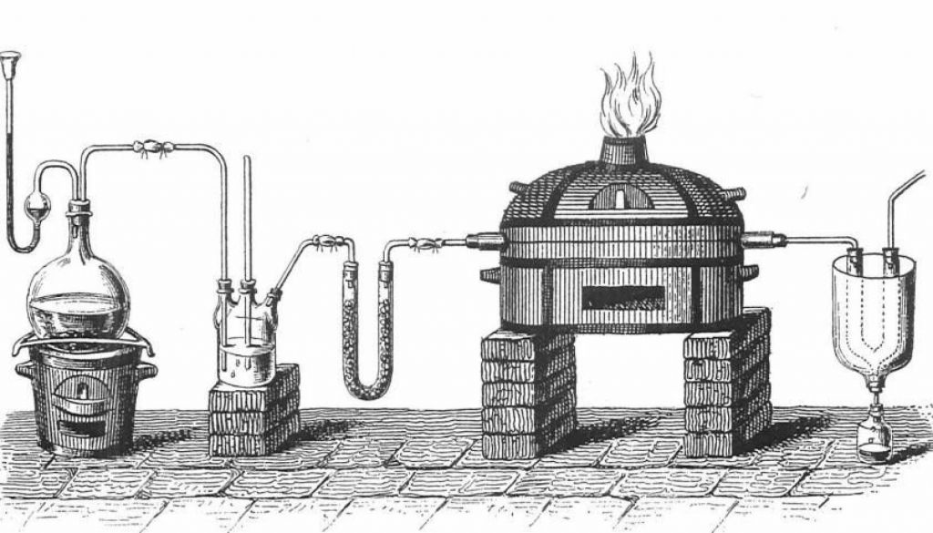 Tổng hợp nhôm clorua khan (AlCl3 ) của Hans Oersted. Sao chép từ sách giáo khoa Đan Mạch năm 1853