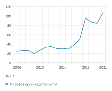 Theo McKinsey, 540.000 tấn lithium cacbonat đã được sản xuất vào năm 2021, tăng 32% so với một năm trước đó. Và việc giảm tốc độ khai thác, làm giàu và xử lý quặng và nước muối lithium không được mong đợi. Chưa có dữ liệu đầy đủ cho năm 2022, nhưng người ta đã biết rằng American Albemarle Corp. riêng công ty có tài sản lithium ở Chile, Hoa Kỳ và Úc, đã sản xuất, theo ước tính sơ bộ, 130-140 nghìn tấn. cacbonat liti. Người đứng đầu hoạt động lithium của công ty này, Eric Norris, trong một cuộc phỏng vấn với Financial Times đã lưu ý rằng vào năm 2019, thị trường lithium không cho thấy bất kỳ sự tăng trưởng nghiêm trọng nào, tăng 30-50 nghìn tấn mỗi năm. Ông nói: “Bây giờ thị trường đang tăng 200 nghìn tấn mỗi năm.