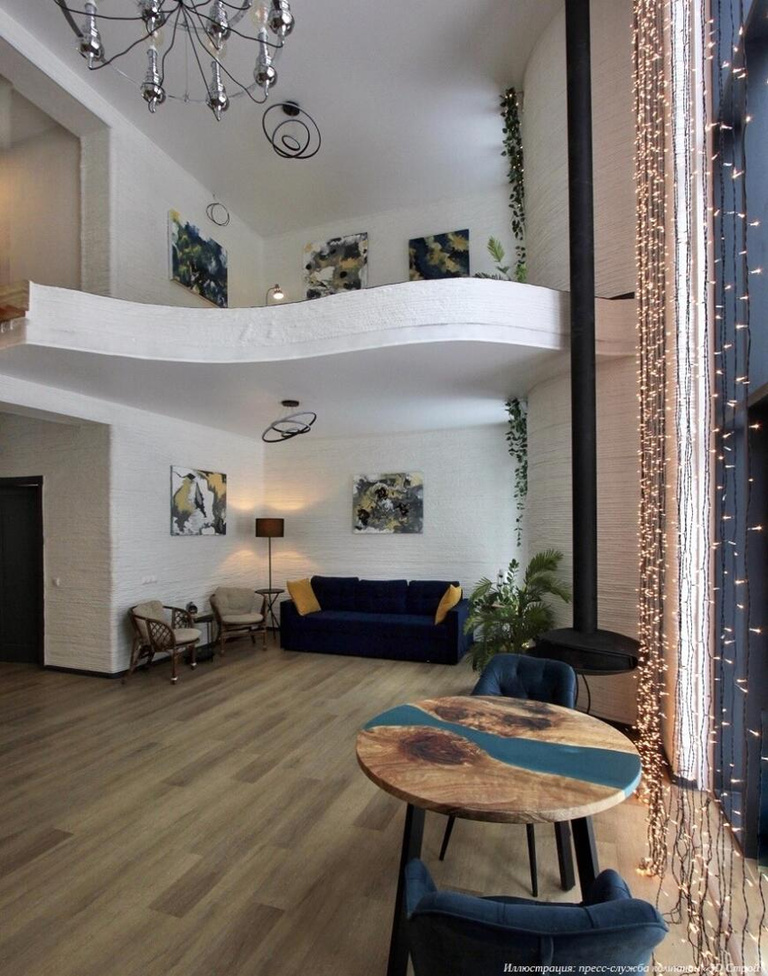 Mỗi tòa nhà dân cư có hai phòng ngủ, một phòng khách, hai phòng tắm và một nhà bếp. Một căn phòng như vậy có diện tích chín mươi mét vuông có thể chứa tối đa tám khách. Ván khuôn cố định được dựng lên bằng máy in 3D xây dựng S-300 do công ty Yaroslavl AMT sản xuất, in bằng hỗn hợp bê tông và được cung cấp với nhiều phiên bản, có khả năng phát triển các kết cấu có diện tích lên tới một trăm tám mươi mét vuông và chiều cao lên tới bảy mét. Chất độn trong dự án này là bê tông gỗ - bê tông nhẹ có bổ sung gỗ.