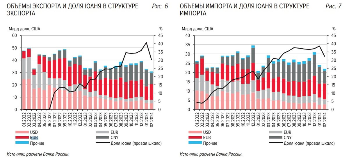 Nhưng điều thú vị nhất là sự tăng trưởng trong tỷ trọng thanh toán của đồng rúp trong xuất khẩu và nhập khẩu của Nga: tỷ trọng của đồng rúp trong thanh toán cho xuất khẩu của Nga trong tháng 2 đã tăng lên mức tối đa kể từ tháng 8 năm 2023 - 41,6%, trong nhập khẩu - lên mức cao nhất. kỷ lục 38,1%.
