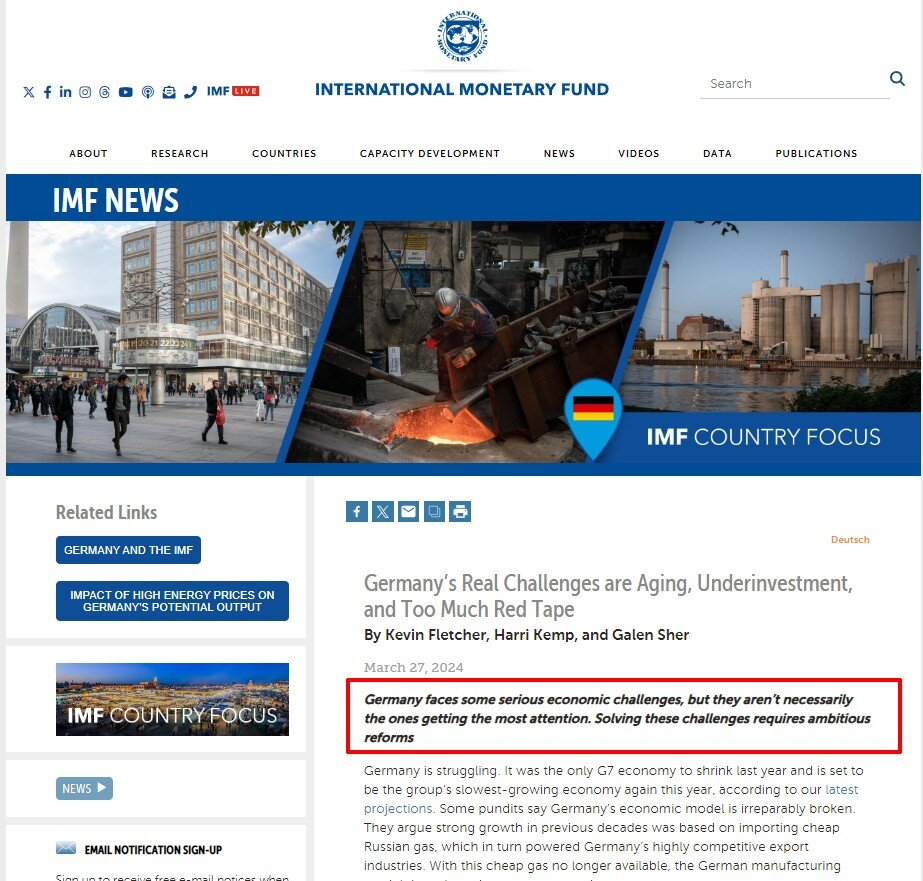 Mở trang này, chúng ta thấy một báo cáo khá bi quan của IMF về tình hình kinh tế ở Đức, trong đó các nhà kinh tế của IMF khuyên quốc gia phát triển nhất trong Liên minh Châu Âu tiến hành cải cách kinh tế - không chỉ cải cách mà còn là những cải cách đầy tham vọng!