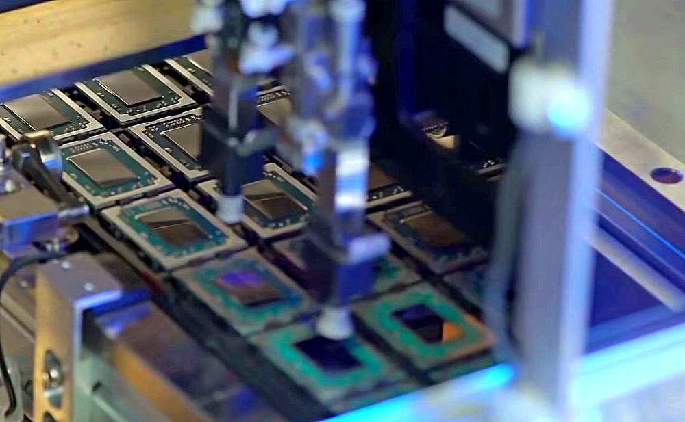 Tên đầy đủ của mô-đun là chip-on-board. Robot chuyển các vi mạch từ các tấm sang đế sợi thủy tinh - sử dụng kim, bôi keo khô nhanh, sau đó sử dụng cốc hút chân không để tháo vi mạch và gắn nó lên bảng đế. Người vận hành theo dõi quá trình này trên màn hình.