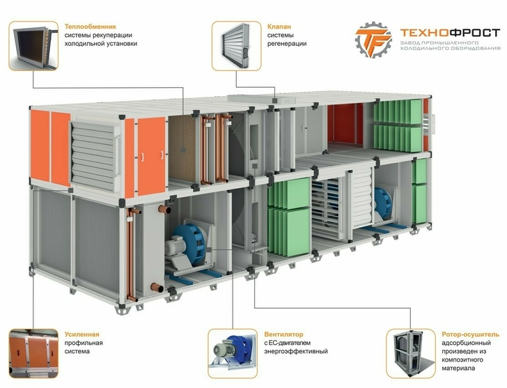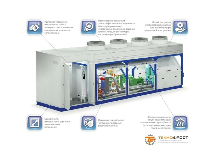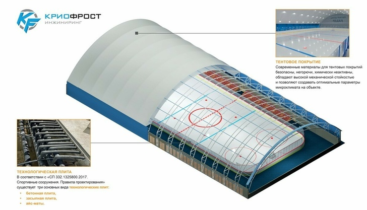 Độ bao phủ băng chất lượng cao ở nhiệt độ không khí lên tới +7˚С được cung cấp bởi các thiết bị làm lạnh trên máy nén trục vít do nhà máy TechnoFrost sản xuất, được chế tạo theo thiết kế monoblock. Các thiết bị này được phân biệt bằng thiết kế nhỏ gọn, được cân nhắc kỹ lưỡng: chúng yêu cầu diện tích tối thiểu để bố trí và cung cấp khả năng tiếp cận dễ dàng tới tất cả các bộ phận để bảo trì.