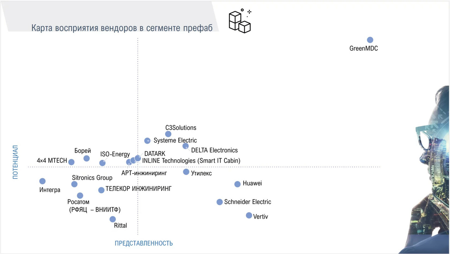 Nghiên cứu “Bản đồ nhà cung cấp trung tâm dữ liệu” đã được trình bày tại hội nghị và triển lãm thường niên lần thứ 18 “Trung tâm dữ liệu 2023”, được tổ chức tại Moscow vào tháng 9. Nó thể hiện bối cảnh thay đổi của các giải pháp kỹ thuật cho trung tâm dữ liệu và nhận thức của đối tượng nhà cung cấp trong sáu lĩnh vực: sản xuất UPS, làm mát, giá đỡ CNTT, SCS, bộ máy phát điện diesel và trung tâm dữ liệu đúc sẵn. Trong danh mục Nhà lắp ghép, GreenMDC dẫn đầu với khoảng cách rộng.