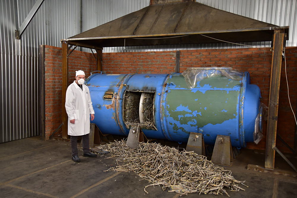 Dmitry Podberezny, người đứng đầu bộ phận tháo dỡ tại AEKhK, giải thích: “Chúng tôi gửi các thiết bị đã tháo dỡ từ xưởng đến tòa nhà để phân mảnh và khử nhiễm. — Ở đó, chúng tôi tháo rời tất cả các chi tiết bên trong, sau đó chúng tôi cắt phần thân bằng cách sử dụng khí và cắt plasma, sau đó bằng máy mài. Chúng tôi gửi các mảnh để khử nhiễm chất lỏng. Mọi thứ đều do con người thực hiện. Đây là những điều kiện làm việc nguy hiểm - cần phải có thiết bị bảo hộ cá nhân và làm việc theo ca.”