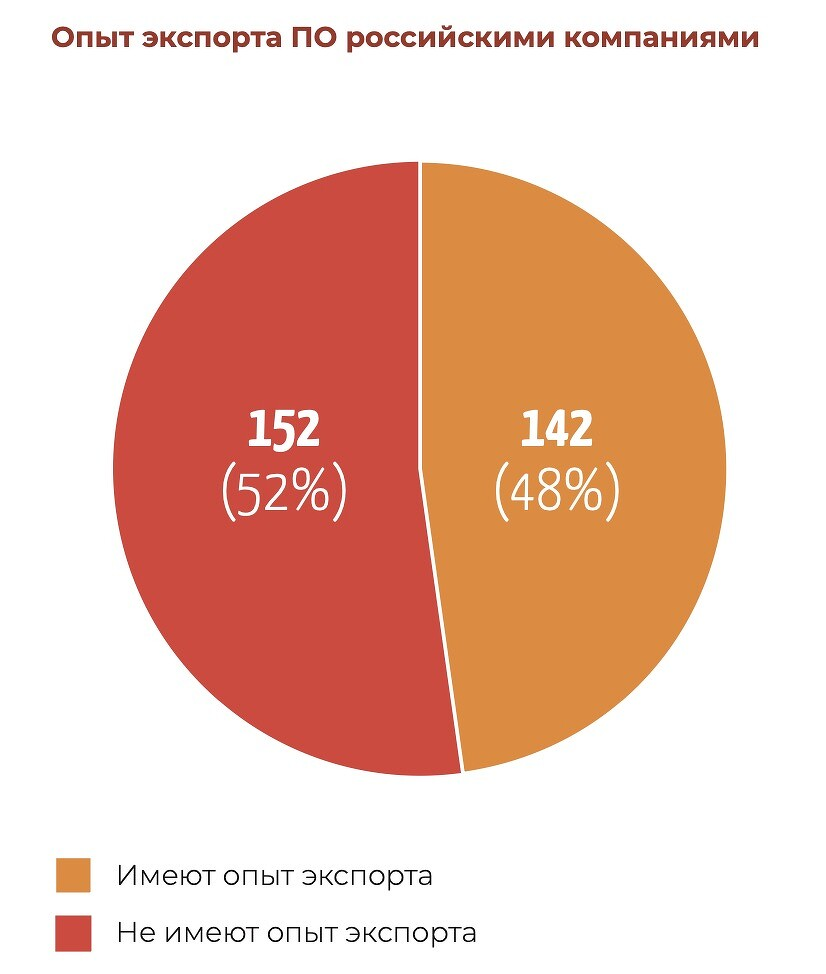 Theo nghiên cứu xuất khẩu của Russoft , khoảng một nửa số công ty phát triển phần mềm của Nga đã là nhà xuất khẩu tích cực và 40% khác quan tâm đến xuất khẩu. Vì vậy, chúng ta có thể nói rằng 94,2% tổng số công ty CNTT của Nga bằng cách này hay cách khác đều hướng tới xuất khẩu.
