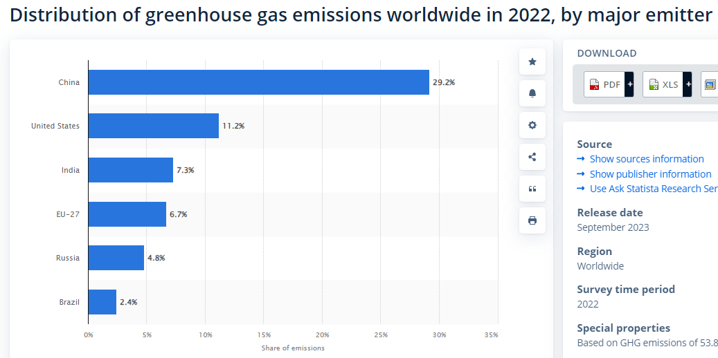 Nếu bạn thực hiện một số công việc đơn giản, bạn có thể dễ dàng nhận thấy rằng những quốc gia đứng đầu về ô nhiễm, ngoài Trung Quốc, là Hoa Kỳ và EU. Biểu đồ được hiển thị trong hình ảnh dưới đây. Và tính theo bình quân đầu người, Hoa Kỳ đứng đầu. Ngoài ra, top 5, dù người ta có thể nói gì, bao gồm Nhật Bản và EU. Dữ liệu gần đây hơn - từ báo cáo của Chương trình Môi trường Liên Hợp Quốc (UNEP) năm 2022 - cũng cho thấy Ủy viên Châu Âu đã đưa ra, nói một cách nhẹ nhàng, một kết luận đáng ngờ, bởi vì các quốc gia xét về lượng phát thải khí nhà kính được phân bổ như sau: Trung Quốc , Mỹ, Ấn Độ, EU, Indonesia, Nga, Brazil.