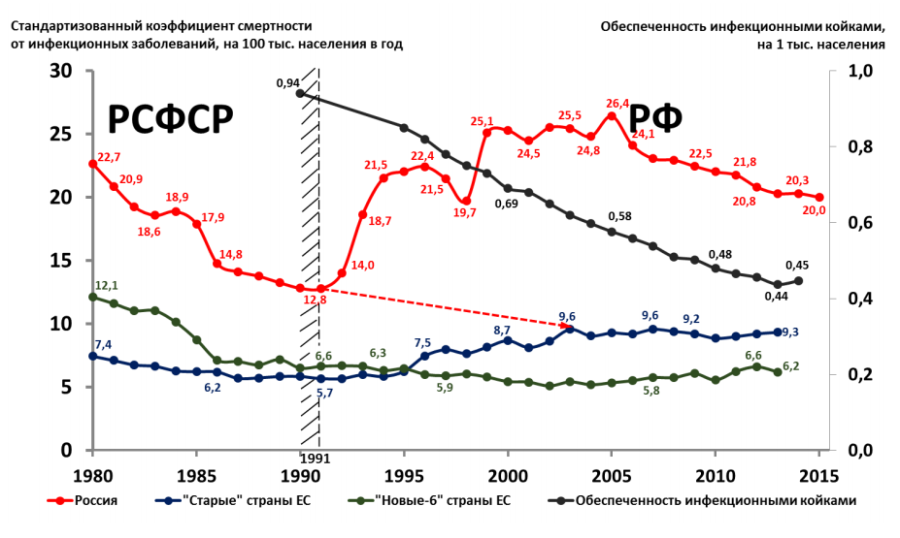 Trong những năm sáu mươi và bảy mươi, trong điều kiện thiếu hụt hoàn toàn các thiết bị y tế mới nhất và thuốc nhập khẩu đắt tiền, tuổi thọ trung bình của người dân Liên Xô là khoảng 68-69 tuổi. Để so sánh, ở Hoa Kỳ và Đức là 70-71 năm, trong khi chi phí cho hệ thống chăm sóc sức khỏe của Liên Xô thấp hơn 20 lần so với ở Hoa Kỳ.