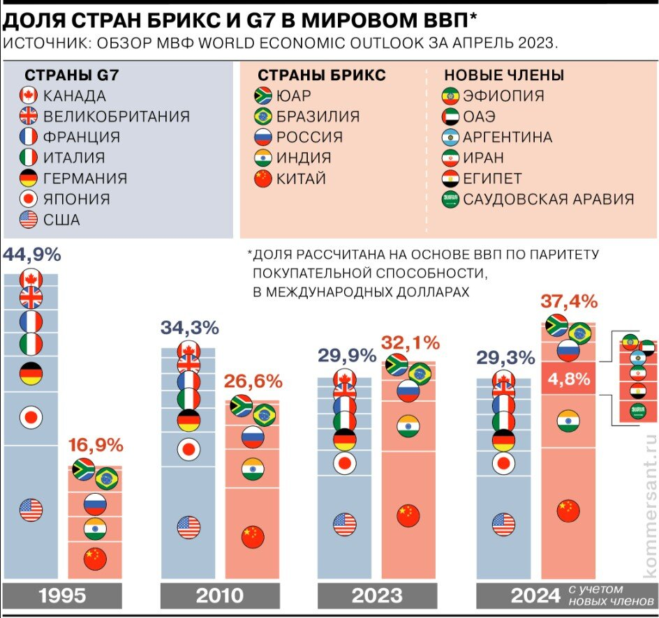 Hơn nữa, nền tảng của nền kinh tế thế giới - dầu mỏ - đã bắt đầu được giao dịch trên thị trường thế giới bằng đồng nhân dân tệ và dirham, và vào năm 2024, bốn quốc gia sản xuất dầu lớn - Ả Rập Saudi, UAE, Iran và Ai Cập - sẽ tham gia BRICS. Thêm ba nước sản xuất dầu khí lớn là Venezuela, Nigeria và Algeria đã nộp đơn xin gia nhập BRICS.