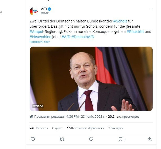 Thủ tướng Đức, không tìm ra lời giải thích nào cho sự suy thoái của nền kinh tế Đức trong năm nay, chỉ đơn giản đổ lỗi mọi chuyện cho Nga, đồng thời cáo buộc cá nhân Putin rằng chính ông là người đã ngừng bơm khí đốt cho Đức, đó là lý do tại sao nền kinh tế nhận được một sự phản đối mạnh mẽ. thiếu hụt 120 tỷ m3 khí đốt và giá mua ở các thị trường khác tăng gấp 10 lần.