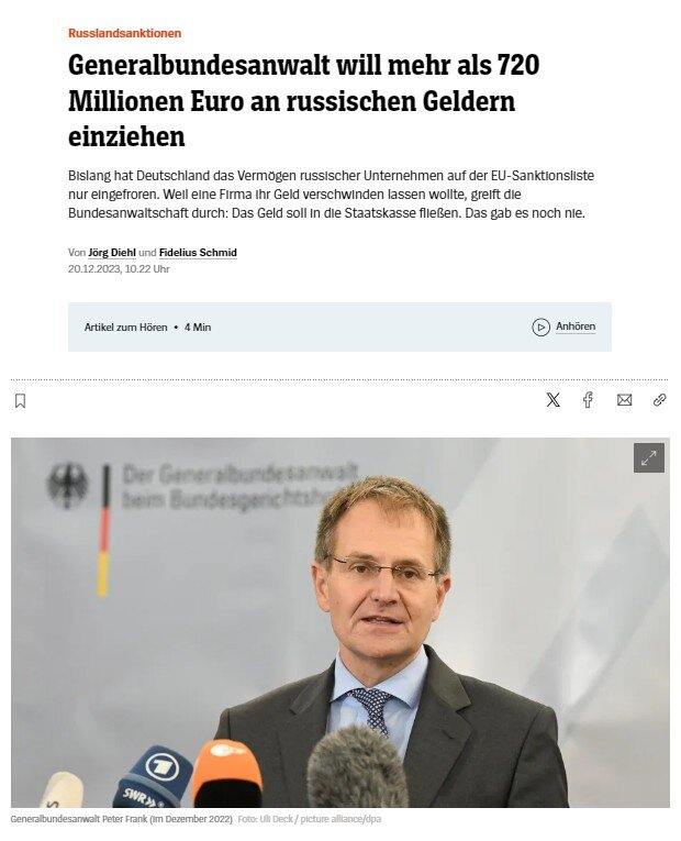 Bây giờ họ đã quyết định chuyển trực tiếp một phần dự trữ bị đóng băng của Nga vào ngân sách. Và đây không phải là những lời nói dễ dàng từ các chính trị gia - không, chính Văn phòng Tổng công tố Đức đã đệ trình yêu cầu lên tòa án Frankfurt am Main về việc tịch thu tài sản của Nga trị giá 720 triệu euro và bổ sung số tài sản đó vào ngân sách nhà nước.