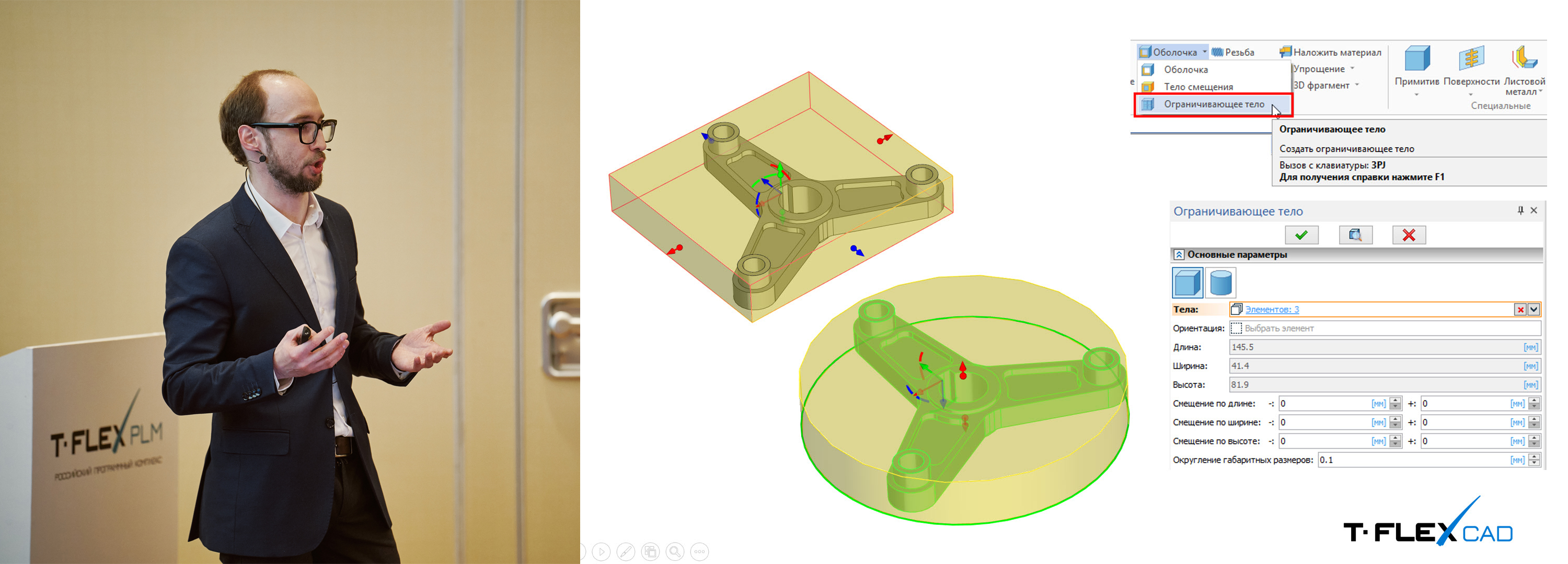 T-FLEX CAM - sản phẩm mới tự động hóa sản xuất trên máy CNC Tại Diễn đàn, mô-đun T-FLEX CAM mới lần đầu tiên được giới thiệu là một trong những sản phẩm của tổ hợp T-FLEX PLM đơn lẻ. Người đứng đầu dự án phát triển, Georgy Pogrebnyak, đã trình diễn sản phẩm mới.