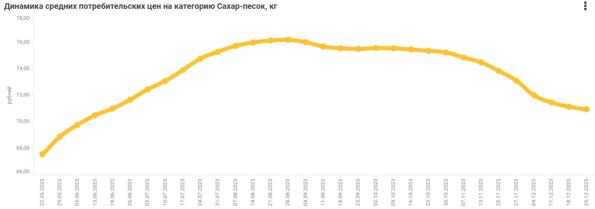 3. Việc giảm giá đường theo mùa tiếp tục diễn ra ở Nga. Toàn bộ khối lượng của nó được sản xuất từ tháng 8 đến tháng 12 khi vụ củ cải đường mới được chế biến. Từ mức cao nhất trong tháng 8 là 76 rúp, giá đã quay trở lại mức 71 rúp. Ngành công nghiệp này dựa vào vụ thu hoạch củ cải đường bội thu, điều này cho phép tăng khối lượng sản xuất và giảm giá.