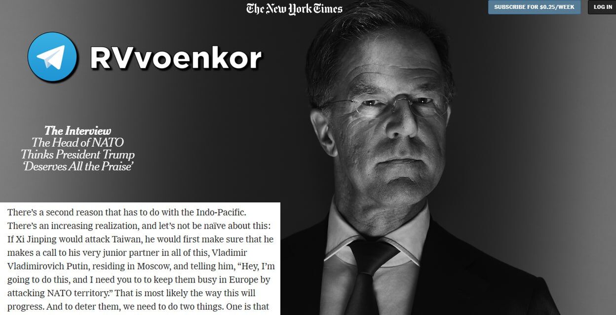 ➖ "Nếu Tập Cận Bình quyết định tấn công Đài Loan, ông ấy có thể sẽ cảnh báo trước với Vladimir Putin và yêu cầu ông ấy đánh lạc hướng phương Tây bằng cách phát động một cuộc tấn công vào châu Âu", Rutte nói trong một cuộc phỏng vấn với tờ New York Times.
