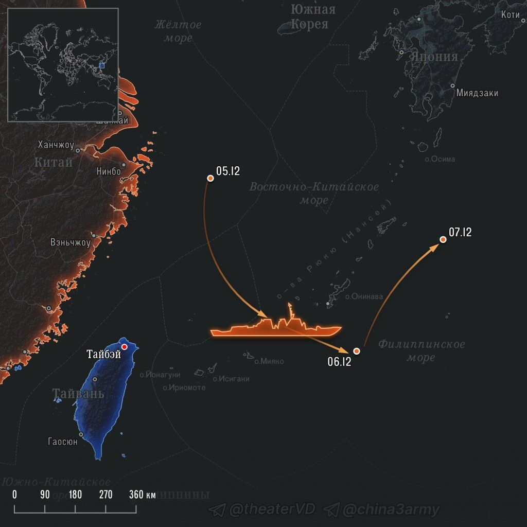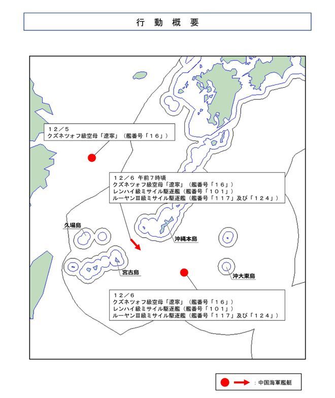 Hôm nay, có thông báo rằng nhóm tác chiến tàu sân bay (CCG) của Hải quân PLA, do tàu sân bay Liêu Ninh dẫn đầu, lần đầu tiên kể từ khi huấn luyện bên ngoài chuỗi đảo thứ nhất, đã được triển khai gần lục địa Nhật Bản, cách đảo Kikai thuộc tỉnh Kagoshima 190 km về phía đông, di chuyển về phía bắc dọc theo phía đông nam của quần đảo Ryukyu.