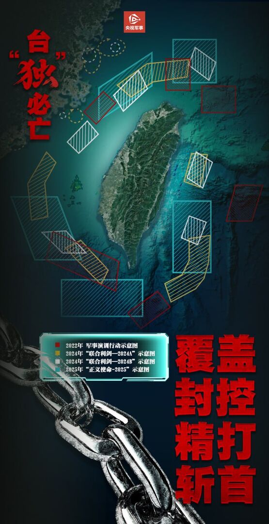 "Nhiệm vụ Công lý 2025": Lực lượng Cảnh sát biển Trung Quốc thuộc tỉnh Phúc Kiến đã triển khai ít nhất năm tàu tuần tra để tuần tra vùng biển ven bờ xung quanh Đài Loan. Mục tiêu là đánh giá hiệu quả của năng lực giám sát và thực thi pháp luật. Cuộc diễn tập bao gồm bảo vệ nghề cá chung, kiểm tra và nhận dạng tàu thuyền, cũng như chặn bắt và tạm giữ.